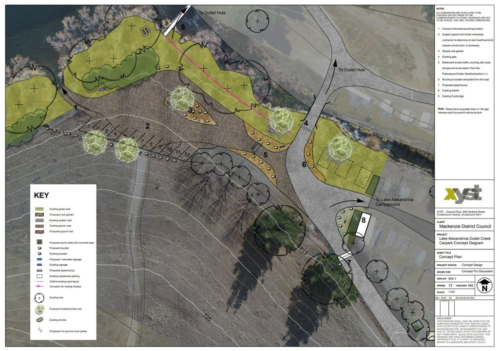 The Mackenzie District Council engaged Xyst to scope a redesign of the Lake Alexandrina outlet carpark area, produce a Concept Diagram, and undertake discussions with communities in the area. Key objectives of the plan were to formalise car parking spaces, reduce traffic speed, and isolate pedestrian and camping areas. The plan also needed to protect the adjacent natural environment and create a safe space for birdlife, whilst enhancing amenity for visitors to the area.