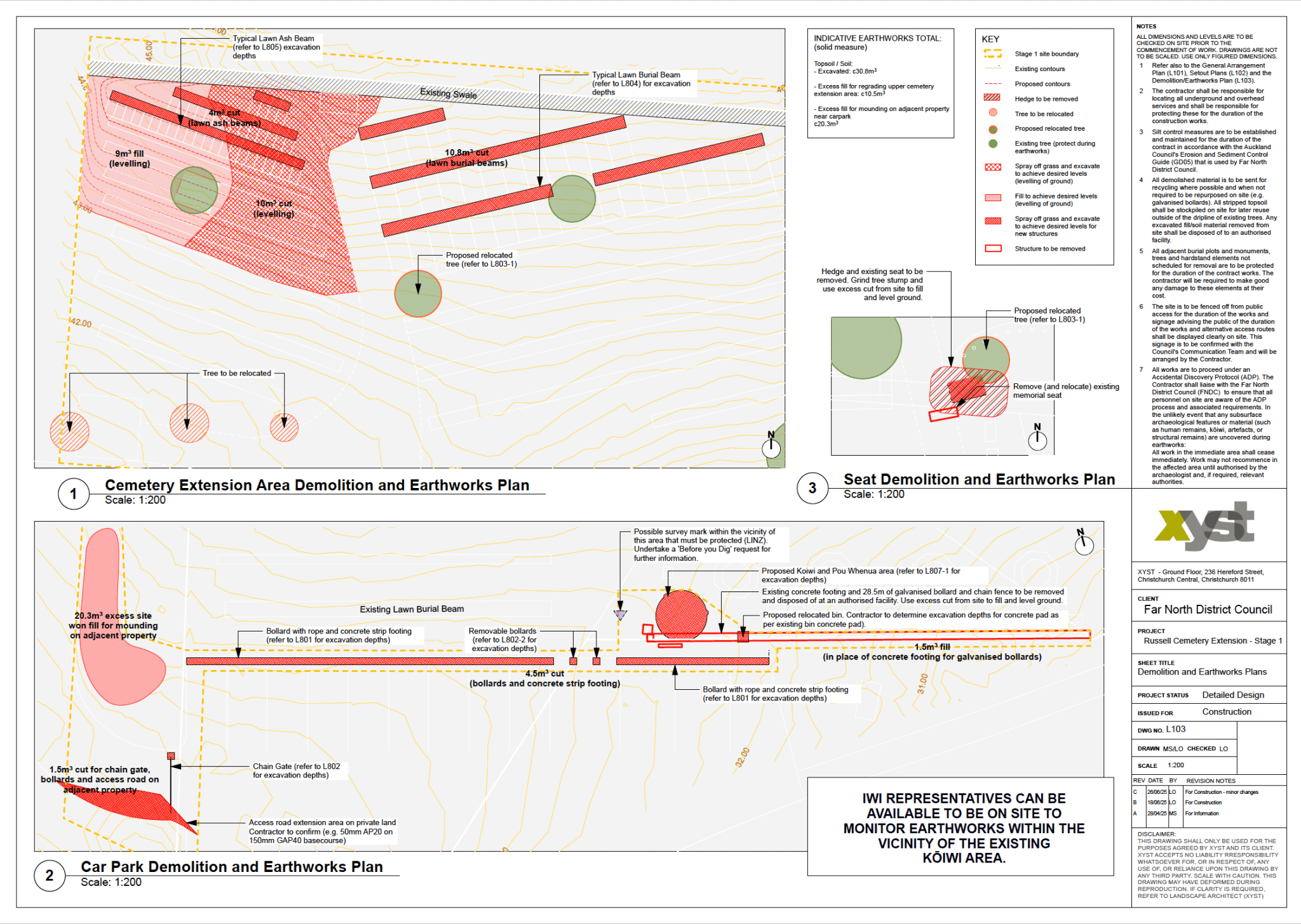 The detailed design translates the approved concept plan (initially undertaken by Xyst) into plans for construction, including 32 new lawn burial plots and 40 lawn ash plots, organised with concrete beams and clearly marked rows. A kōiwi (re-burial) area with three pou whenua recognises cultural heritage, while site enhancements include the removal of a small hedge section, relocation of existing memorial seating and trees, and installation of access controls such as bollards, gates, and fencing.